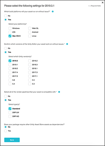 For each section, select Yes to display a question and a set of checkboxes. Then check or uncheck the options that answer the questions about your package. When you’re finished, click Save to return to the Package upload section.