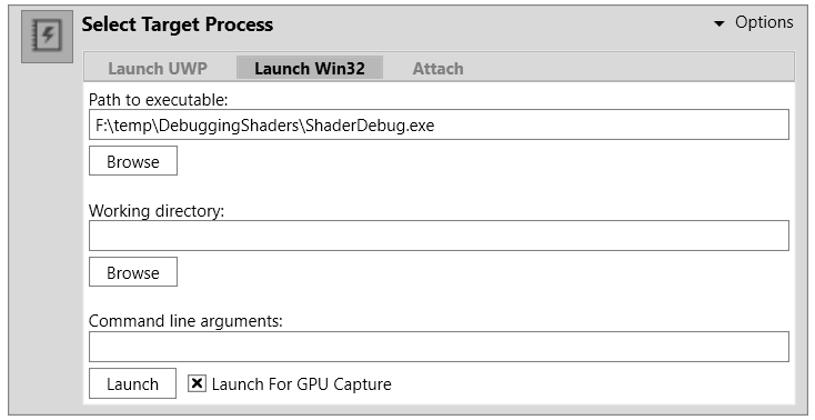 In the Select Target Process box, select the Launch Win32 tab and use the Browse button to select your application’s executable file. Note that here, “Win32” means a non-UWP application; your application file must be a 64-bit binary file.