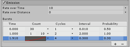 Bursts | A burst is an event which spawns particles. These settings allow particles to be emitted at specified times. |