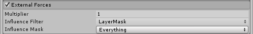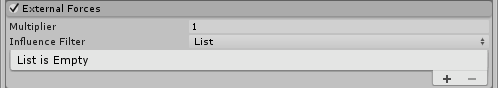 Influence Filter | Choose whether to include Force Fields based on a Layer MaskA value defining which layers to include or exclude from an operation, such as rendering, collision or your own code. More info See in Glossary, or via an explicit List. |