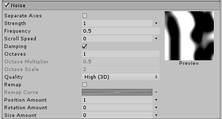 Damping | When enabled, strength is proportional to frequency. Tying these values together means the noise field can be scaled while maintaining the same behaviour, but at a different size. |