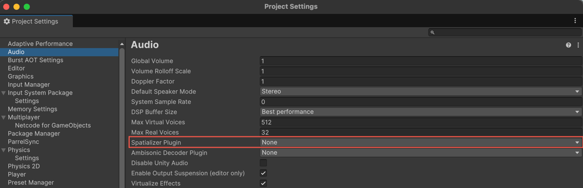 3. Choose the plug-in from the Spatializer Plugin dropdown menu.