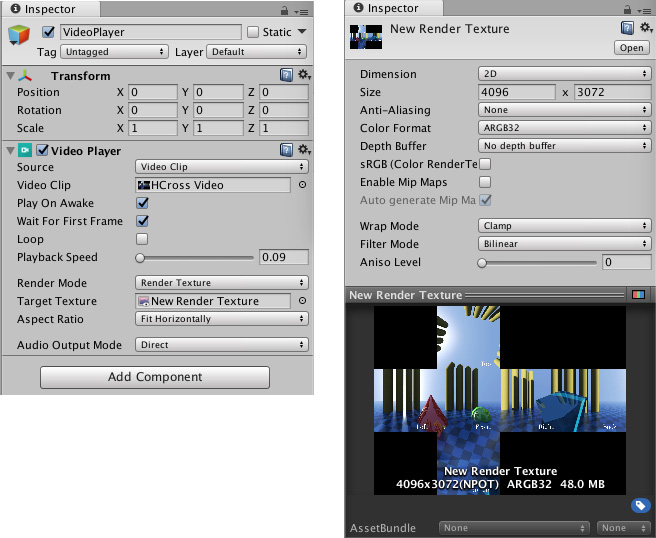 Now, open the Video Player Inspector and switch the Render Mode to Render Texture. Drag your new Render Texture from the Asset view to the Target Texture slot.