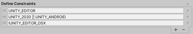 The constraints are satisfied when either UNITY_IOS or UNITY_EDITOR_OSX and UNITY_2019_3_OR_NEWER are defined and UNITY_ANDROID is not defined. Individual lines are analogous to performing a logical AND operation between the constraints in them. The above example is equivalent to: