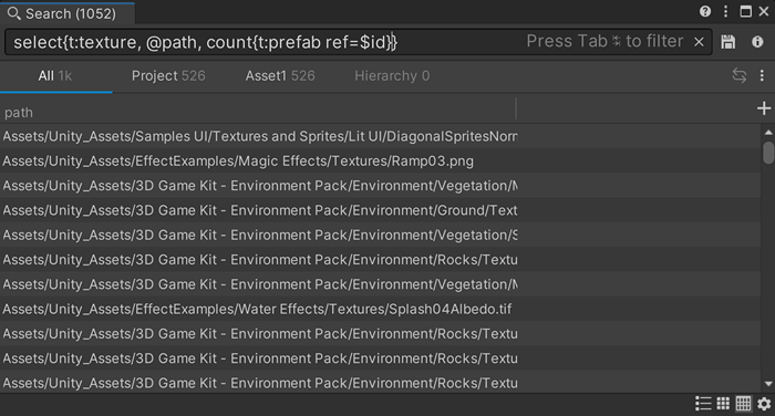 select{t:texture, @path, count{t:prefab ref=@id}}
