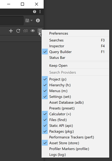 For example, p: is the search token for the Asset Search Provider. When you enter p:Player in the search field, Search searches for Assets that match the term “Player” (for example, assets with “Player” in their names).