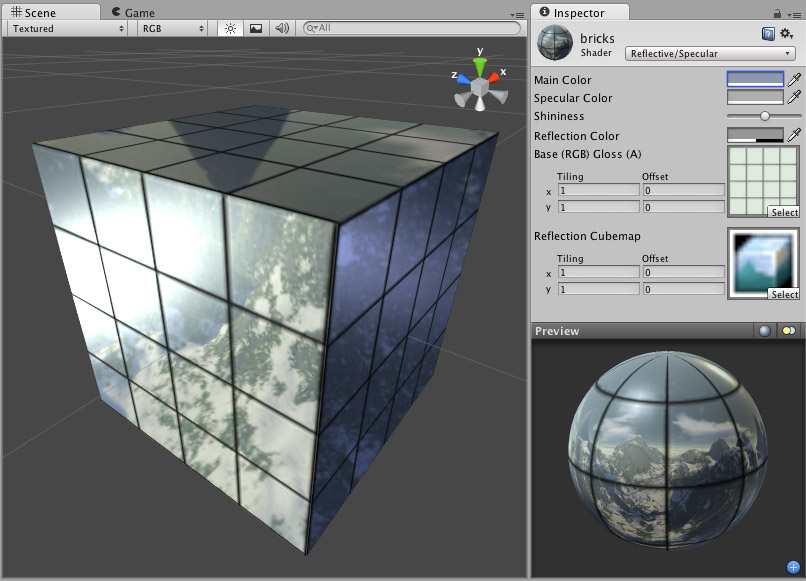 which will define what exactly is reflected. The main texture’s alpha channel defines the strength of reflection on the object’s surface. Any sceneA Scene contains the environments and menus of your game. Think of each unique Scene file as a unique level. In each Scene, you place your environments, obstacles, and decorations, essentially designing and building your game in pieces. More info