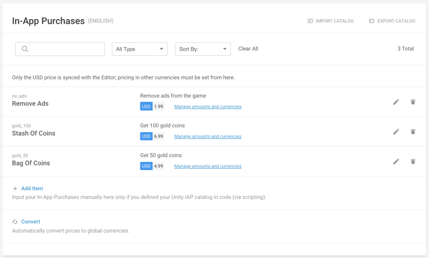 If you maintain an IAP Catalog in your game client, UDP keeps it synchronized between the Unity Editor and the UDP console.