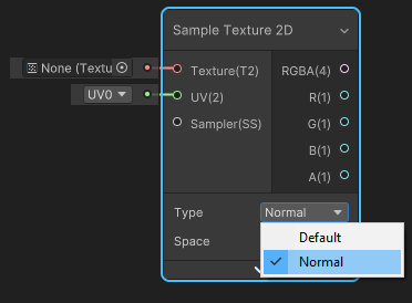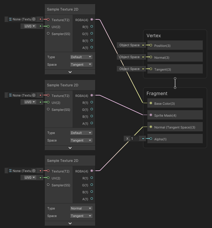 Drag each of the Texture 2D properties onto the editor window. Attach each of the properties to the Input Slots of the Sample Texture 2D Nodes as shown below. Note that the ‘NormalMap’ property must be attached to the Normal Type Node only.
