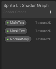 Create three Texture 2D properties by selecting the + on the Blackboard, and then select Texture 2D. Name them ‘MainTex’, ‘MaskTex’, and ‘NormalMap’ for this example.