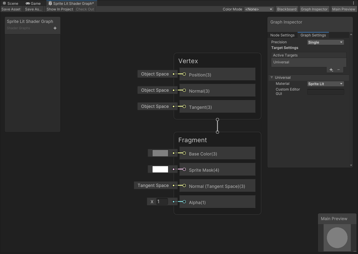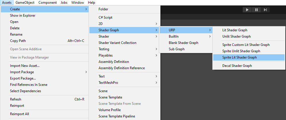 Create a new asset by selecting Assets > Create > Shader Graph > URP > Sprite Lit Shader Graph. The Shader Graph asset is then created in the asset window.