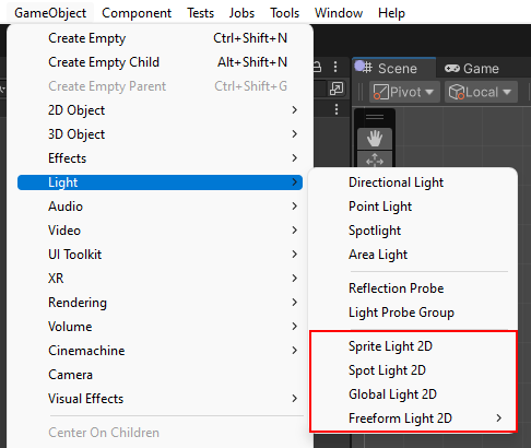 Create a 2D Light GameObject by going to GameObject > Light and selecting one of the four available types.