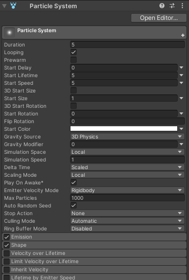 The Particle System's general parameters are kept inside a special Main module. These parameters are visible in the Inspector above all the other modules: