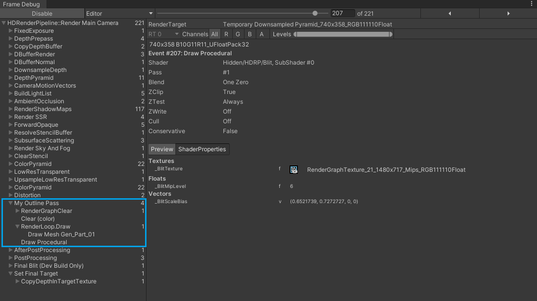 이 예시에서 커스텀 패스 이름은 My Outline Pass입니다. Frame Debug 창(메뉴: