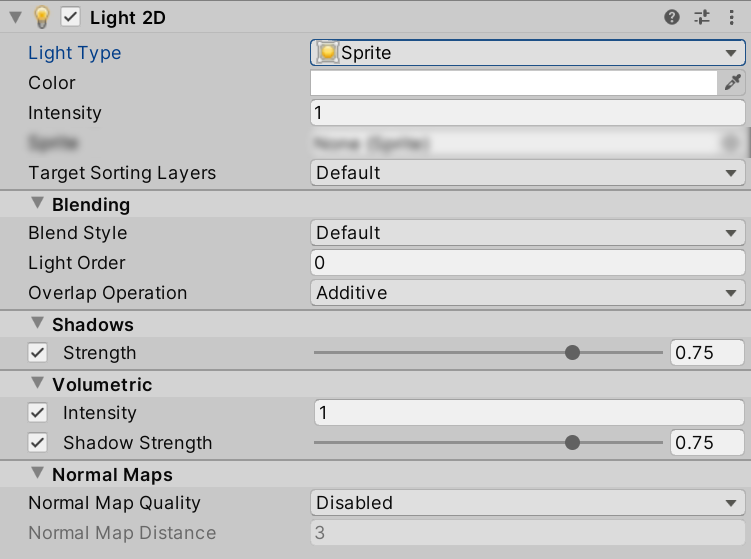 전역 광원을 제외한 모든 광원은 스프라이트 머티리얼의 노멀 맵을 사용하도록 토글할 수 있습니다. 활성화되면, Distance 및 Accuracy가 새 프로퍼티로 표시됩니다.