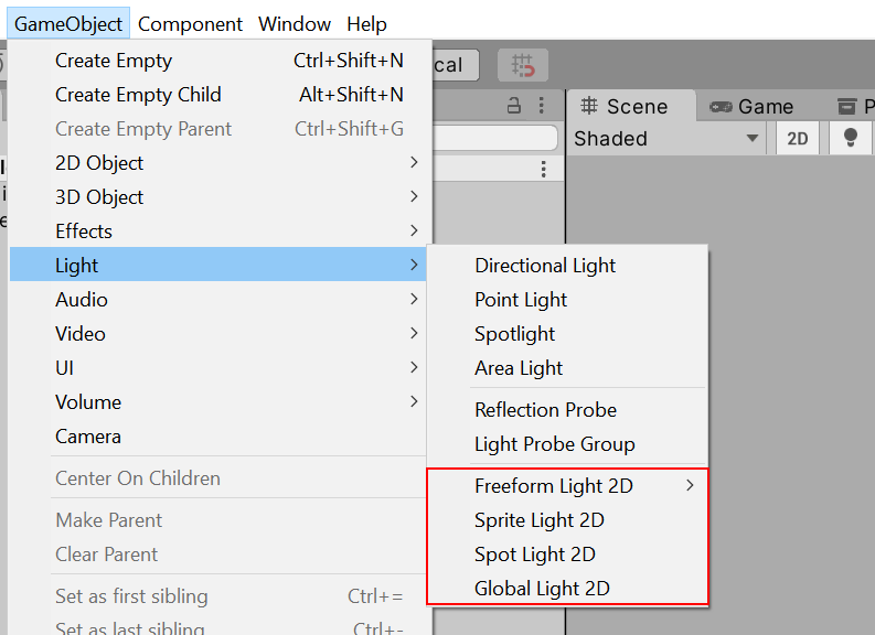 URP에 포함된 2D 기능으로는 2D 광원 및 2D 조명 효과를 생성하기 위한 2D 조명 그래픽스 파이프라인과 프로젝트에서 픽셀화된 시각적 스타일을 구현하기 위한 2D 픽셀 퍼펙트 카메라가 있습니다. 다음은 패키지의 Light 2D 컴포넌트에 포함된 다양한 2D 광원 타입입니다.