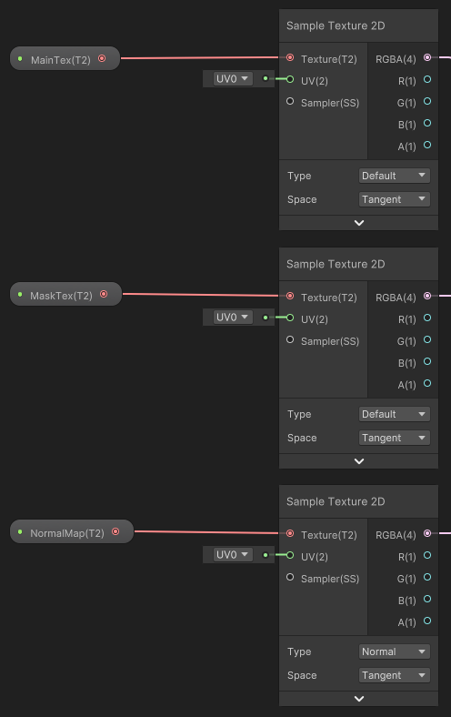 Texture 2D 프로퍼티를 에디터 창으로 드래그합니다. 아래 그림과 같이 각 프로퍼티를 Sample Texture 2D 노드의 입력 슬롯에 연결합니다. 'NormalMap' 프로퍼티는 Normal Type 노드에만 연결해야 합니다.