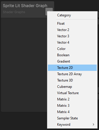 블랙보드에서 +를 선택하여 세 개의 Texture 2D 프로퍼티를 생성한 후 Texture 2D를 선택합니다. 이 예제에서는 'MainTex', 'MaskTex', 'NormalMap'이라고 명명합니다.