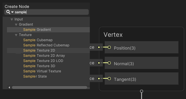 셰이더 그래프 창에서 마우스 오른쪽 버튼을 클릭하고 Create Node를 선택하여 Sample Texture 2D 노드를 생성한 후 Sample Texture 2D 옵션을 검색하여 선택합니다.