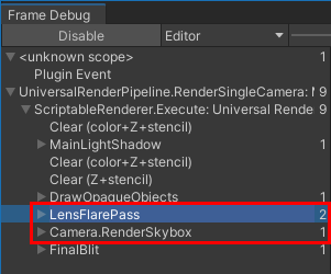 Unity가 렌더 패스를 그리는 순서를 확인하려면 Frame Debugger (Window > Analysis > Frame Debugger)를 엽니다.