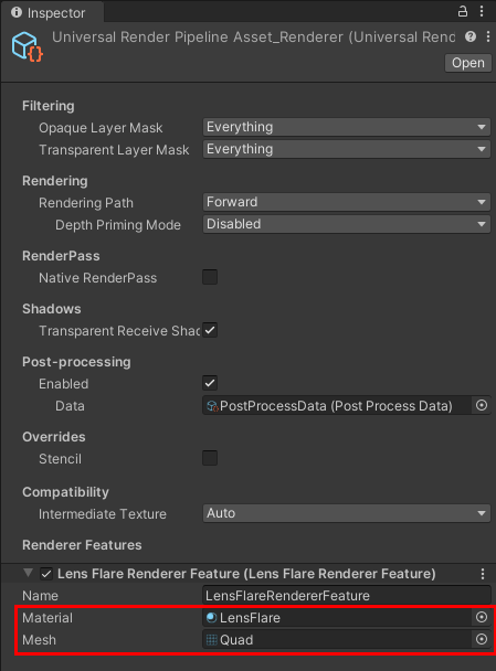 생성한 렌더러 기능을 유니버설 렌더러 에셋에 추가하십시오. 이 링크에서 렌더러에 렌더러 기능을 추가하는 방법을 확인할 수 있습니다.