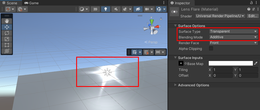 이 예제에서는 렌더러 기능이 사각형에 렌즈 플레어를 텍스처로 그립니다. 이를 구현하려면 머티리얼과 메시(사각형)가 필요합니다.