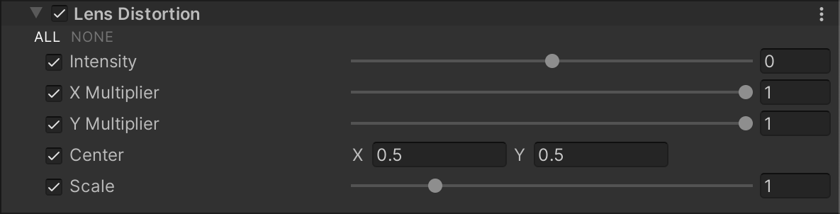| Scale | 슬라이더를 사용하여 전역 화면 스케일링의 값을 설정합니다. 이는 렌더를 확대하여 화면의 경계를 숨깁니다. 높은 왜곡을 사용할 경우 화면 경계의 픽셀이 존재하지 않는 화면 경계 외부의 픽셀 정보에 의존하기 때문에 화면 경계의 픽셀이 깨질 수 있습니다. 이 프로퍼티는 화면 경계 주위에 깨진 픽셀을 숨길 때 유용합니다. |