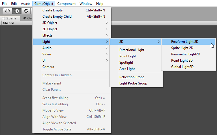 Light 2D 컴포넌트를 사용하여 다양한 광원 타입 중에서 선택할 수 있습니다. 패키지에서 현재 이용 가능한 광원 타입은 다음과 같습니다.