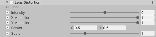 | Scale | 슬라이더를 사용하여 전역 화면 스케일링의 값을 설정합니다. 이는 렌더를 확대하여 화면의 경계를 숨깁니다. 높은 왜곡을 사용할 경우 화면 경계의 픽셀이 존재하지 않는 화면 경계 외부의 픽셀 정보에 의존하기 때문에 화면 경계의 픽셀이 깨질 수 있습니다. 이 프로퍼티는 화면 경계 주위에 깨진 픽셀을 숨길 때 유용합니다. |