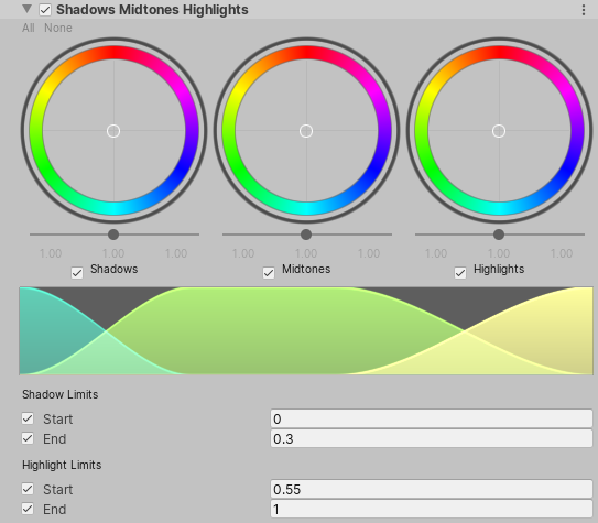 Midtones 이 프로퍼티를 사용하여 미드톤을 제어합니다. 트랙볼을 사용하여 URP가 미드톤 색조를 전환할 대상 컬러를 선택합니다. 슬라이더를 사용하여 트랙볼 컬러의 컬러 밝기를 오프셋합니다.