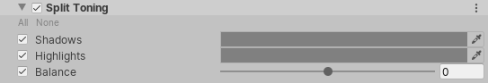 Split Toning은 볼륨 프레임워크를 사용합니다. 따라서 Split Toning 프로퍼티를 활성화하고 수정하려면 씬의 볼륨에 Split Toning 오버라이드를 추가해야 합니다. 볼륨에 Split Toning을 추가하려면 다음 단계를 따르십시오.