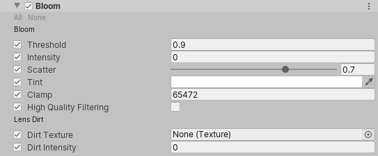| Threshold | URP가 블룸을 적용하는 감마 공간 밝기 값을 설정합니다. URP는 이 값보다 밝기가 낮은 씬의 픽셀에는 블룸을 적용하지 않습니다. 최솟값은 0이며, 아무것도 필터링하지 않습니다. 기본값은 0.9입니다. 최댓값은 존재하지 않습니다. |