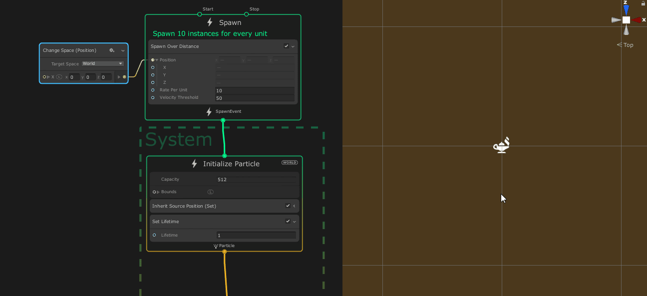 Spawn Over Distance 블록은 이전 프레임 값을 기준으로 하는 포지션의 변위를 계산합니다. 이 변위 크기와 Rate Per Unit 프로퍼티에 따라 시스템이 파티클을 생성합니다.