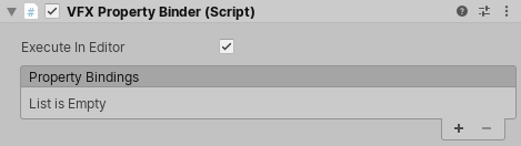 VFX 프로퍼티 바인더라는 일반적인 MonoBehaviour를 통해 프로퍼티 바인더를 추가할 수 있습니다. 이 동작을 통해 하나 이상의 프로퍼티 바인딩을 사용할 수 있습니다. 각 프로퍼티 바인딩은 노출 프로퍼티와 런타임 또는 씬 요소 간의 관계를 생성하는 역할을 담당합니다.