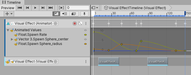 타임라인(및 애니메이션 창)에서 시각 효과 노출 프로퍼티를 애니메이션화하는 작업은 매우 간단하며, 게임 오브젝트 프로퍼티를 애니메이션화하는 작업과 동일한 워크플로를 사용합니다.