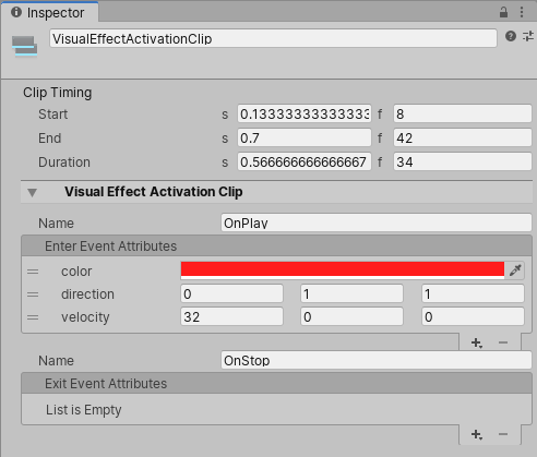 시각 효과 활성화 트랙을 사용하고 트랙에 시각 효과 활성화 클립을 추가하여 타임라인의 시각 효과에 이벤트를 보낼 수 있습니다. 모든 클립은 클립의 시작과 끝에서 두 개의 이벤트를 보내는 역할을 담당합니다. 모든 이벤트는 속성 페이로드를 보내도록 설정될 수 있습니다.