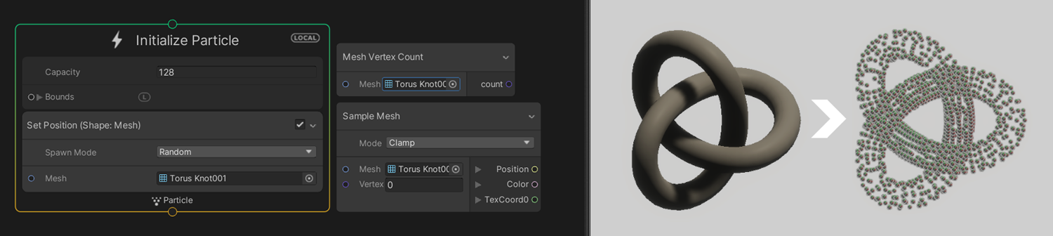 Position (Mesh) 블록과 Sample Mesh 연산자를 사용하여 메시의 버텍스를 샘플링할 수 있습니다.