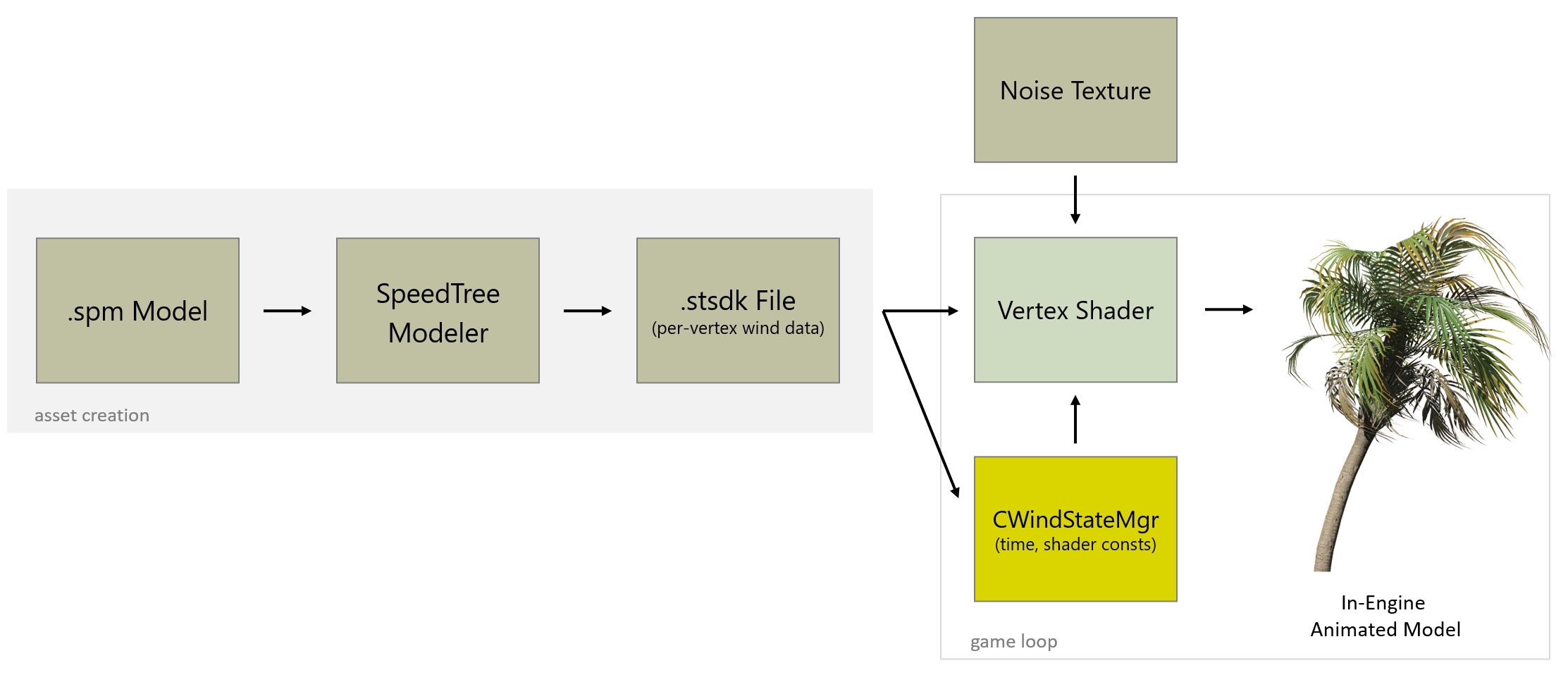feeds state information into a wind-enabled vertex shader through shader constants. The state is defined by an artist in the Modeler application when the wind behavior is tuned.